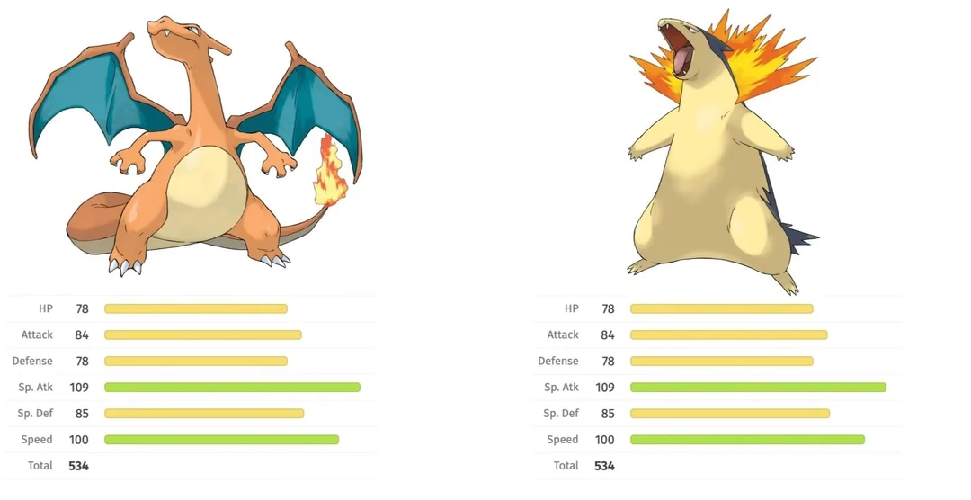 Typhlosion and Charizard have the exact same stats, which is also true of the entire evolution lines