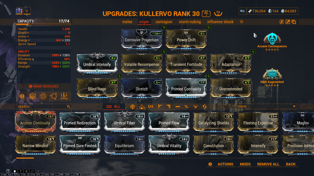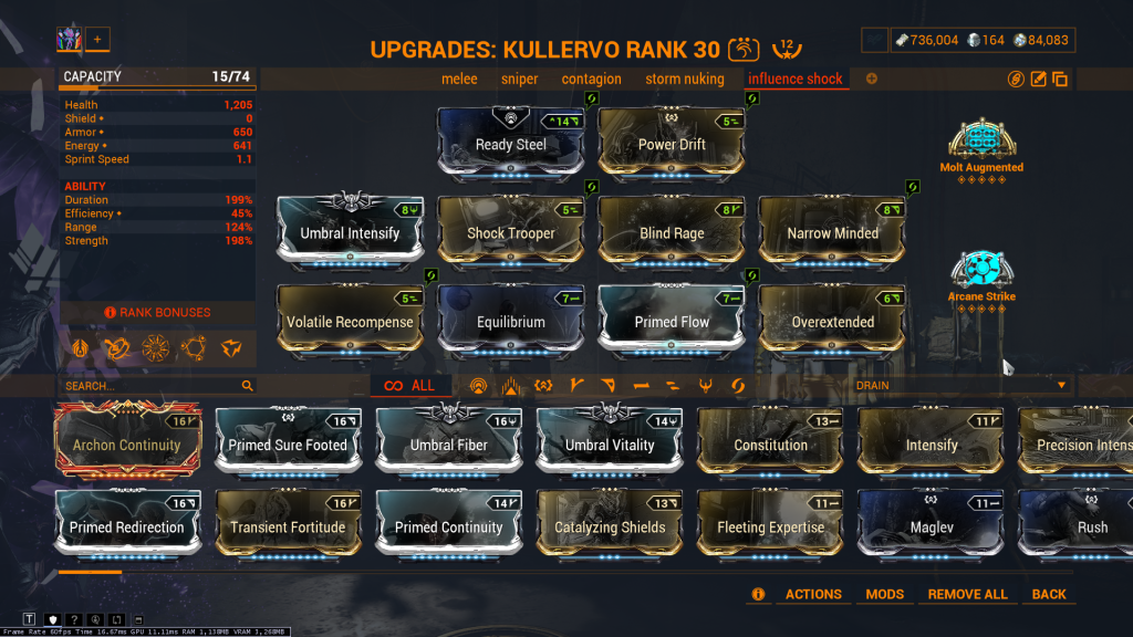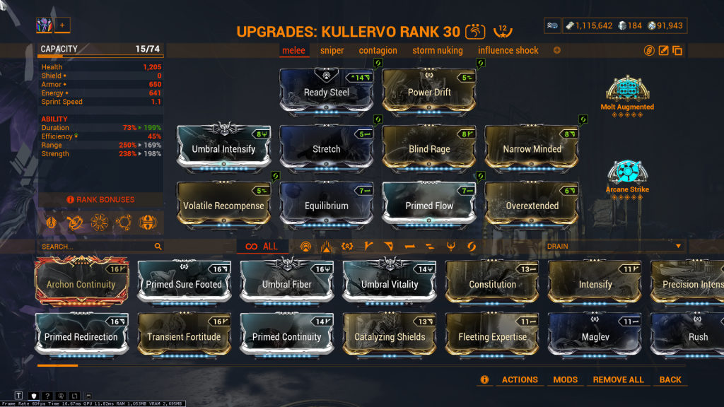 This is my general purpose melee build. Ready steel is some nice quality of life and his abilities will overshadow the benefit of really any aura mod you can slot in there. It’s probably easily replaceable, but on builds such as heavy melee spam, it’s very nice to have. Power drift is there for a similar reason, lack of anything better to put in the slot. Molt Augmented gives an entire extra tier of crit through Wrathful Advance, and Arcane Strike could be replaced by your favorite melee arcane or an Arcane Energize if you find you have energy economy issues, which can happen if using Collective Curse generously enough.