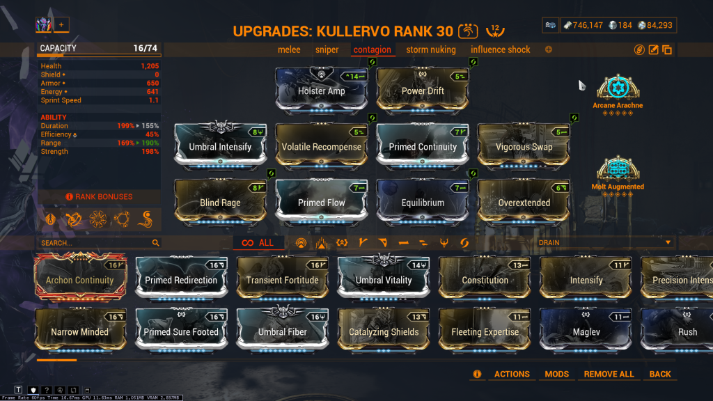 If you’re wondering why I didn’t mention exodia contagion in the previous build for recommended weapons, that’s because this build is better for specific interactions with that arcane. Eclipse applies to contagion twice, so it’s a massive damage increase. Vigorous swap and holster amp are multiplicative where they should be additive, as well as arcane arachne. All of this combines to create some absolutely silly numbers.