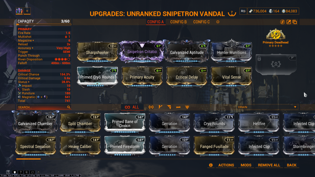 As for weapon recommendations, any sniper will work. I use snipetron vandal as I think it’s funny that it goes against canon, and I have a riven for it. The build will look something like this: