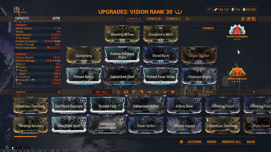 The build for the melee itself looks something like this. I’m honestly by no means an expert on exodia contagion, though I know that condition overload doesn’t apply to the explosion, making it largely meaningless. Exposure seemed like the best arcane to me but again I’m kinda dumb in this area. Build a zaw with whatever strike you have a riven for, or plague kripath like I used here.